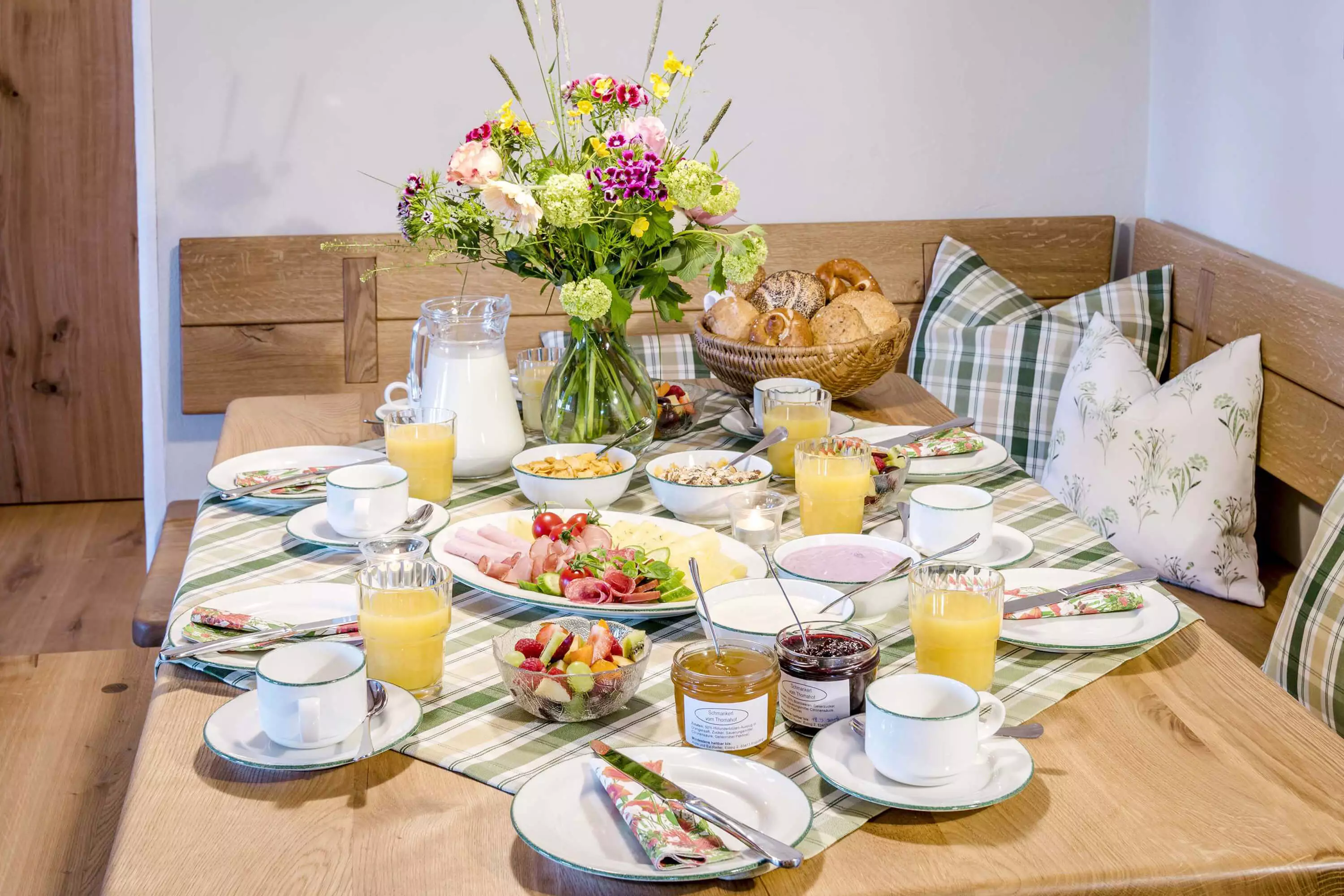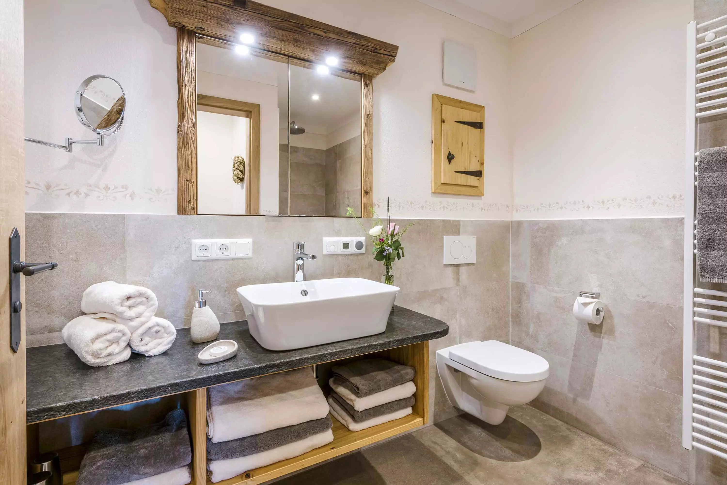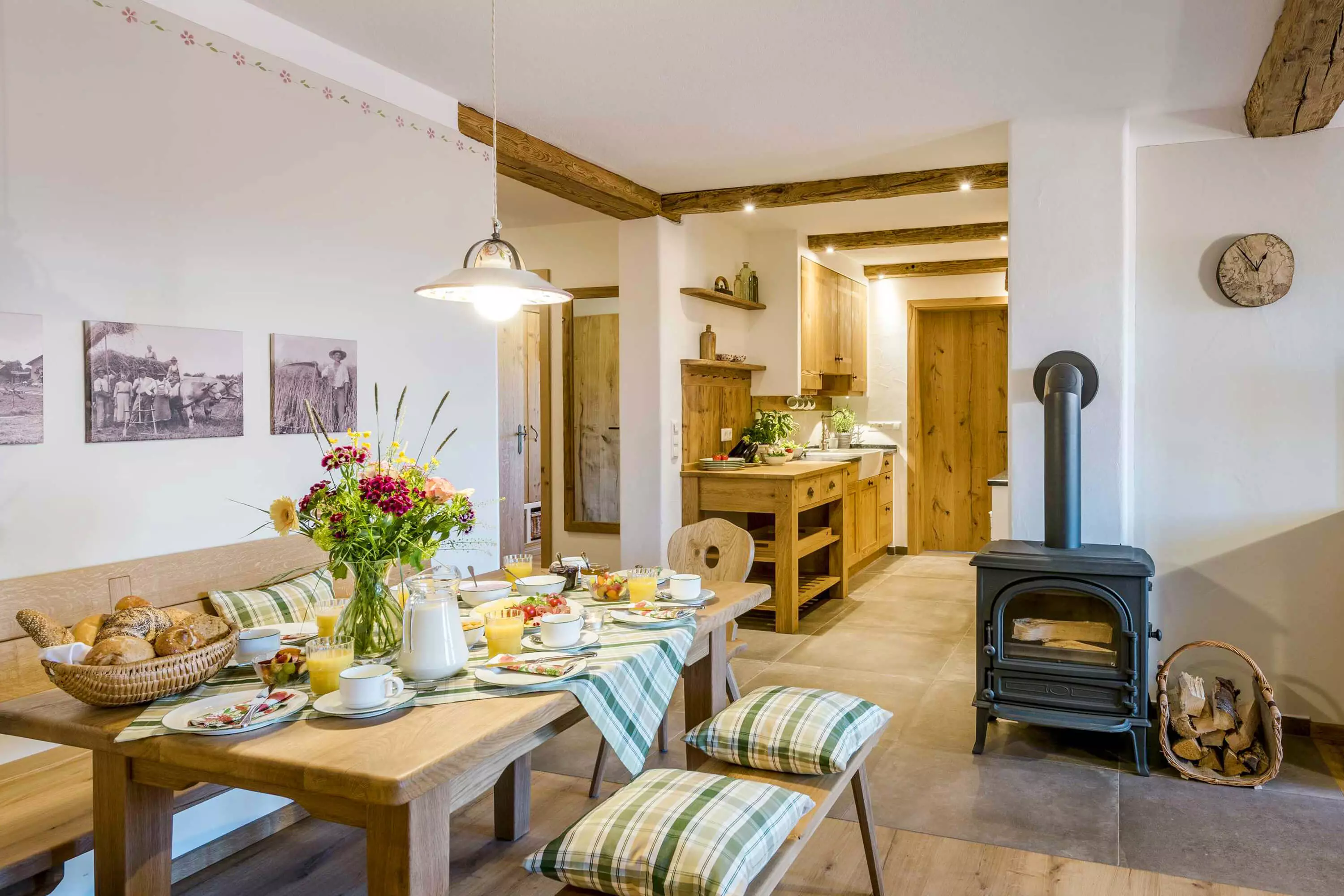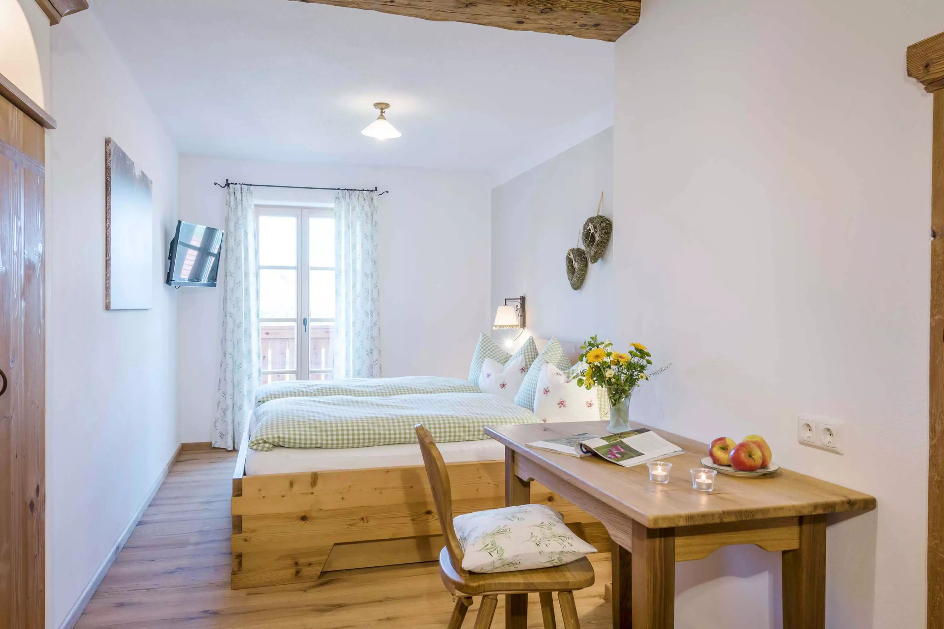 Die 5-Sterne-Luxus-Ferienwohnung "Heuboden" bietet mit einer Größe von etwa 94 qm reichlich Platz für bis zu 6 Personen. Die gemütlich eingerichtete Ferienwohnung befindet sich im zweiten Stock des neu erbauten Bauernhauses, ist komfortabel mit einem Aufzug zu erreichen und besitzt einen Südwest- sowie einen West-Balkon. Sie verfügt über drei getrennte Schlafzimmer: zwei Schlafzimmer mit Doppelbett sowie ein Kinderzimmer mit Etagenbett. Die Küche wie auch die übrige Einrichtung wurde von Schreinern angefertigt. Details, Stoffe und Farben der 5-Sterne-Ferienwohnung "Heuboden" hat Bäuerin Evi liebevoll zum Wohlfühlen ausgewählt.